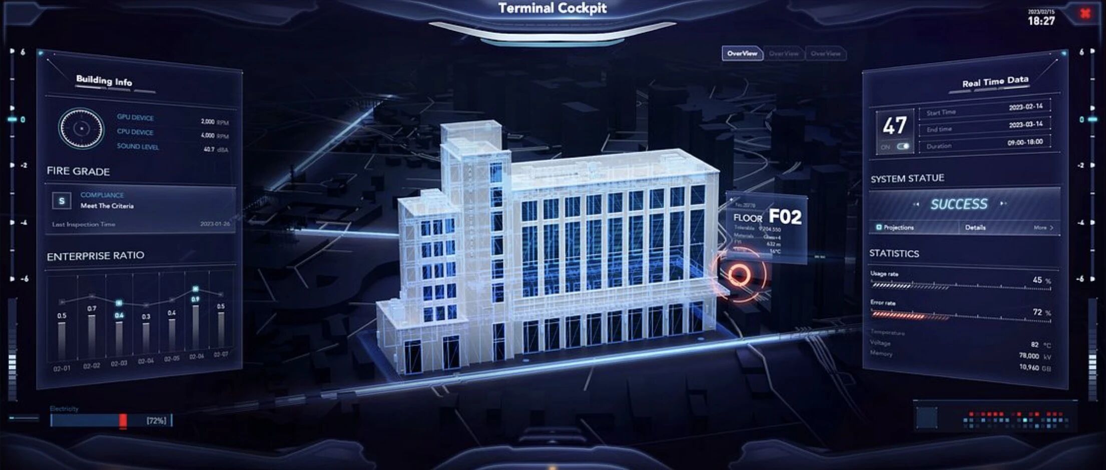通过整合交通、能耗、环保、政务等数据,大屏实时显示城市运行态势,实现对城市的数字孪生与智能调度。